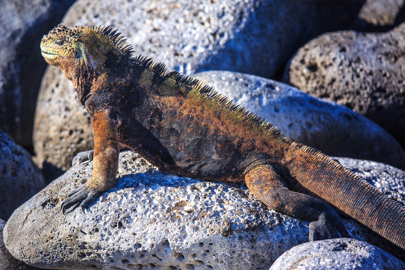 Other modern lizard species haven't adapted to a marine lifestyle for good reason: survival at sea presents a lot of challenges. For example, the ocean is much colder than land.As ectothermic (cold-blooded) animals, marine iguanas can't regulate their own body temperatures, so spending a lot of time in cold water puts them at risk of hypothermia (and also shrinkage, you'll see). To prevent this, the iguanas spend much of their time sunbathing and congregate in large groups to conserve body heat. Their dark coloration provides them an advantage here as well, as it helps them absorb extra heat from the sun. Despite these adaptations, marine iguanas can only withstand ocean temperatures for about ten minutes—any longer than that, and they won’t have the energy to make it back to shore. Upon returning from foraging, the normally laid-back marine iguanas often behave aggressively, hoping to intimidate potential predators into leaving them alone while they are cold and weak.